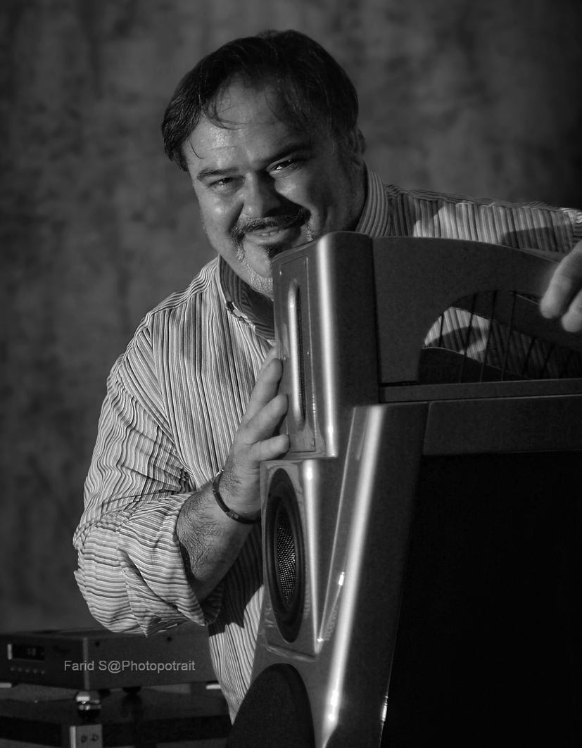 Selesai memotret ruangan beserta produknya. Penulis langsung berkonsultasi dengan klien, dengan bertanya, mau seperti apa foto profilnya ? Dijawab, Sang pembuat speaker difoto beserta produknya, pokoknya produknya terlihat. Mungkin bagi sebagian fotografer ini adalah mudah, karena tinggal memasang flash pada kamera lalu menggunakan teknik bounching (memantulkan cahaya) maka permintaan itu akan terpenuhi. Tapi penulis berpikir lain, sepertinya akan lebih baik jika foto potrait dilakukan dengan mengatur posisi lampu disamping orang tersebut, sehingga akan ada efek bayang. Mungkin istilah sekarang disebut strobist. Efek bayang yang ingin penulis tampilkan agar memperkuat karakter si pembuat speaker ini. Setelah dilakukan beberapa kali perpindahan posisi flash, maka ini lah hasilnya :
